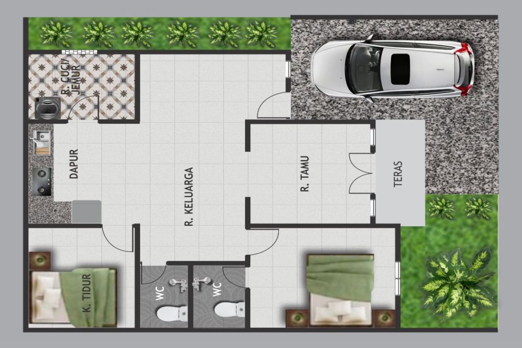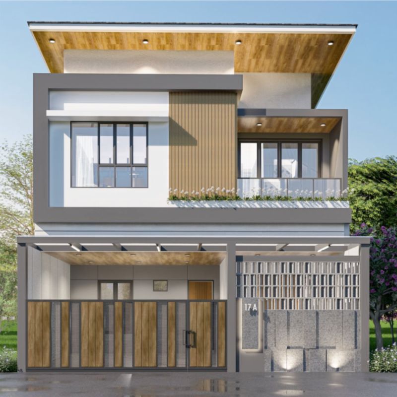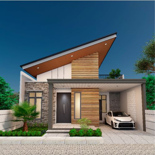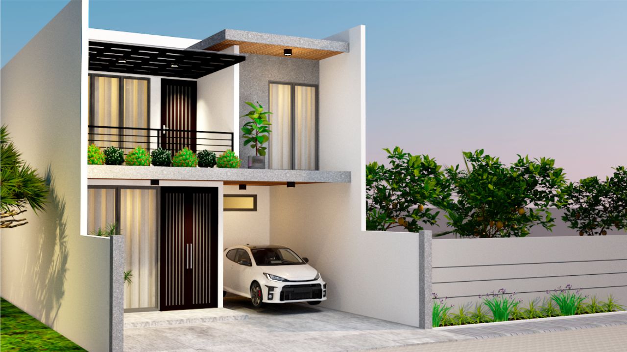Rumah ini mengusung konsep minimalis modern dengan tampilan fasad elegan dan tegas. Salah satu keunggulan desain ini adalah area carport yang luas, cocok untuk 2 mobil atau tambahan ruang multifungsi. Cocok untuk keluarga aktif yang butuh rumah stylish sekaligus fungsional.